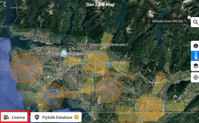 1. On your controller ensure you are logged into the same DJI account you were on when you submit the application. Then open the GEO Zone map again and click on License in the bottom left of the screen