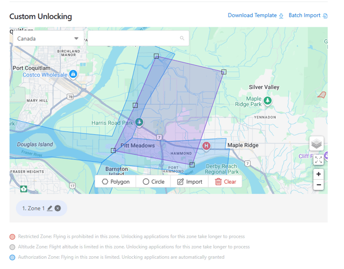 - Custom Unlocking: Use to unlock a custom flight area (including GEO Zones). Draw a Polygon, Circle, or import coordinates to outline your flight area on the map.