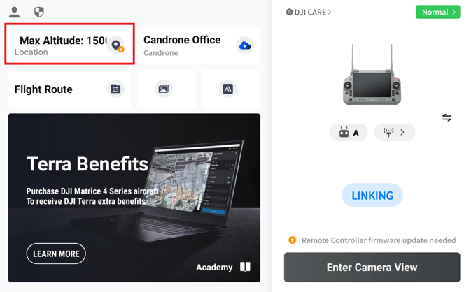 | Check No-Fly Zones | Tap Max Altitude > View Map on Controller |