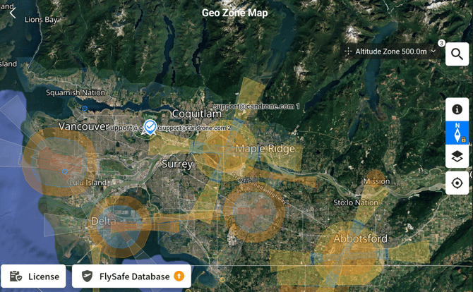 🛑 In places like Vancouver, where airspace is complex and populated, many overlapping zones may appear.