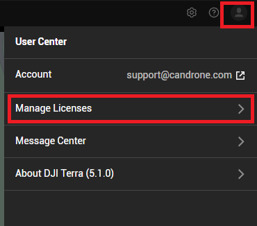 5. Go back to DJI Terra. Click on the User Icon, click on Manage Licenses, and you should see the license show up in the list now.